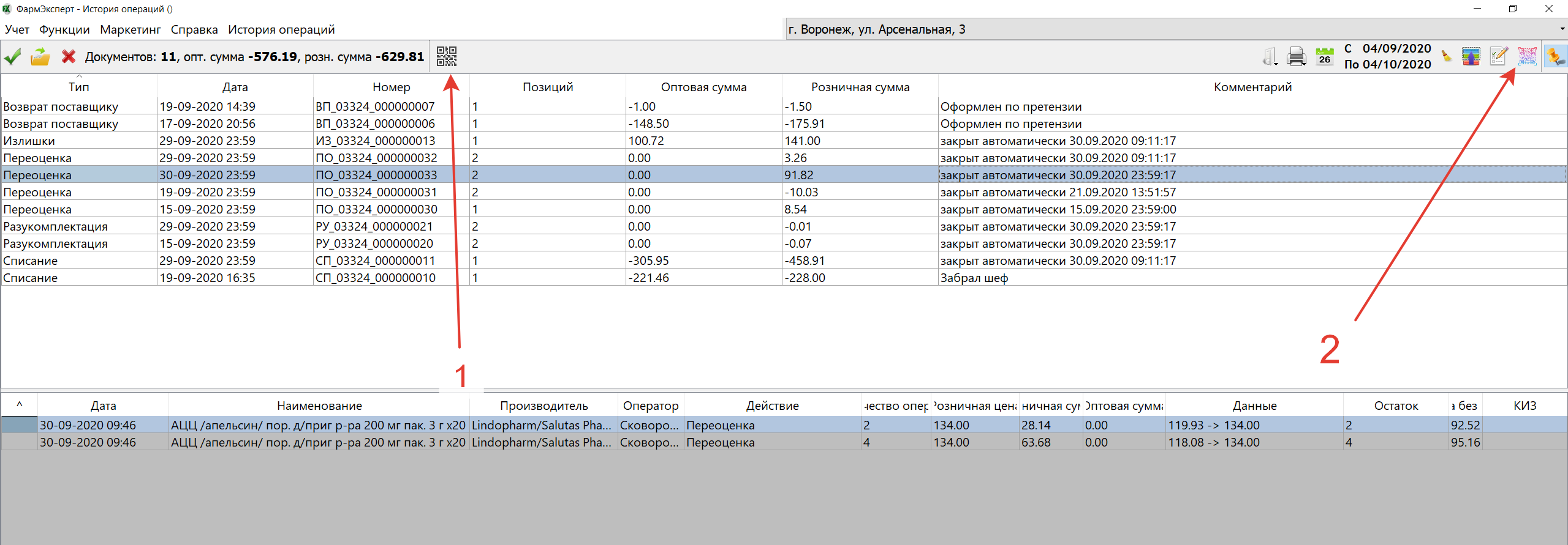 20. В связи с нестабильностью работы серверов МДЛП мы отказались от автоматической отправки данных по операциям изменения количества (видеоинструкцию можно посмотреть здесь) и перенесли эту возможность в раздел История операций. Теперь по проведённым операциям изменения количества по маркированным позициям нужно отправить документ в МДЛП из истории операций (стрелка 1). Также в этом разделе можно отфильтровать документы с различными статусами обработки в МДЛП - успешно обработан, обрабатывается и ошибка обработки (стрелка 2). Подсветка номера документа по аналогии с подсветкой накладных с маркировкой в журнале накладных визуально подскажет состояние обработки документа.
