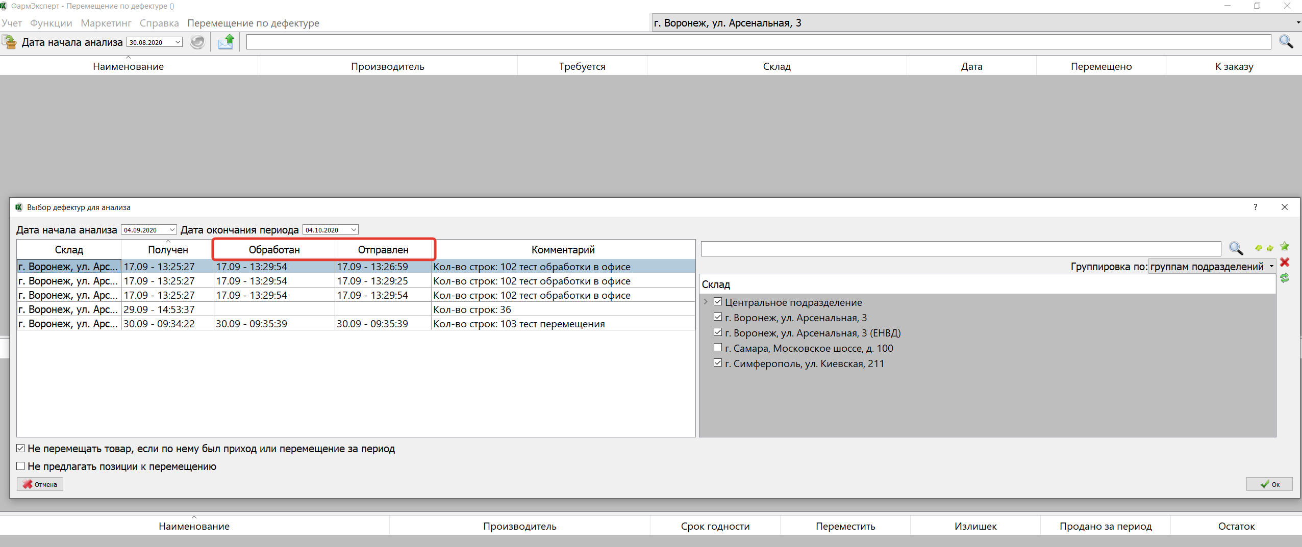 21. В разделе "Перемещение по дефектуре" переделана логика даты/времени обработки и отправки дефектуры. Датой обработки является окончание работы в разделе и нажатие на кнопку с зелёной галкой. Дата отправки заказа заполняется той же датой, если при этом остались позиции, которые необходимо заказать у поставщика. Таким образом пустая дата заказа говорит о том, что вся потребность была распределена между излишками других аптек вашей аптечной сети и были сформированы необходимые перемещения товара.