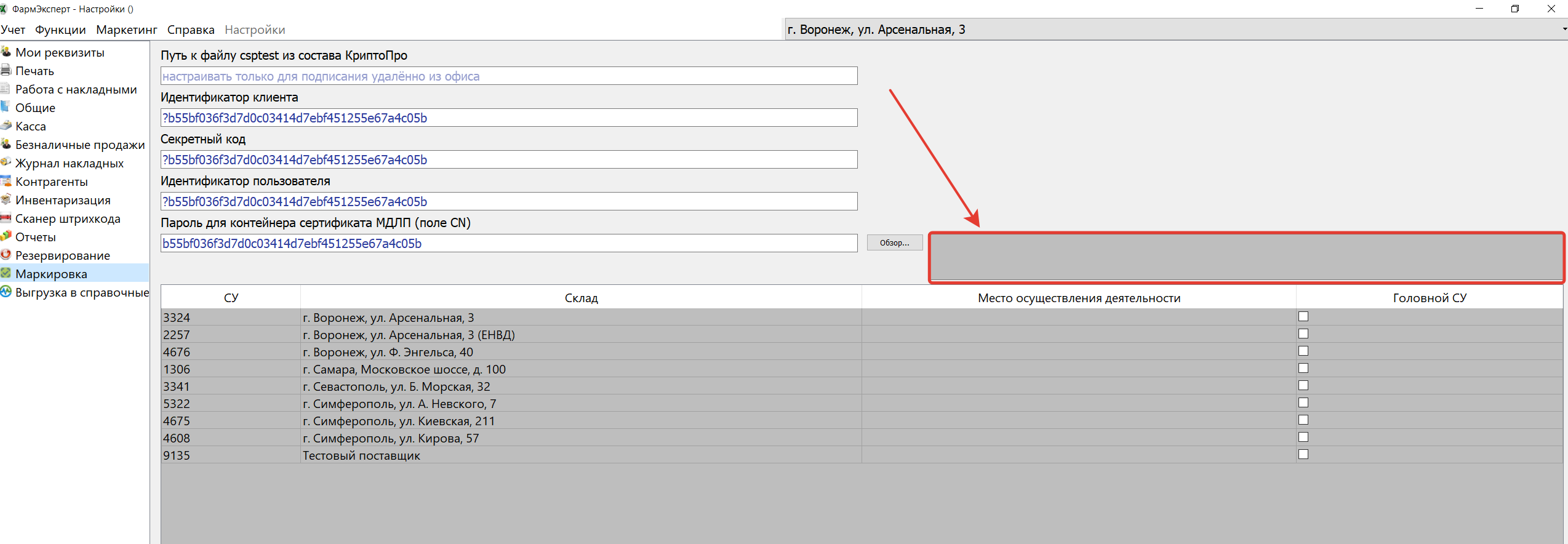 32. При выборе сертификата в настройках Маркировки добавлено отображение данных по сертификату (выделено на скрин-шоте), а также ФармЭксперт проводит контроль срока действия выбранного сертификата и информирует пользователя,если срок истекает или истёк.