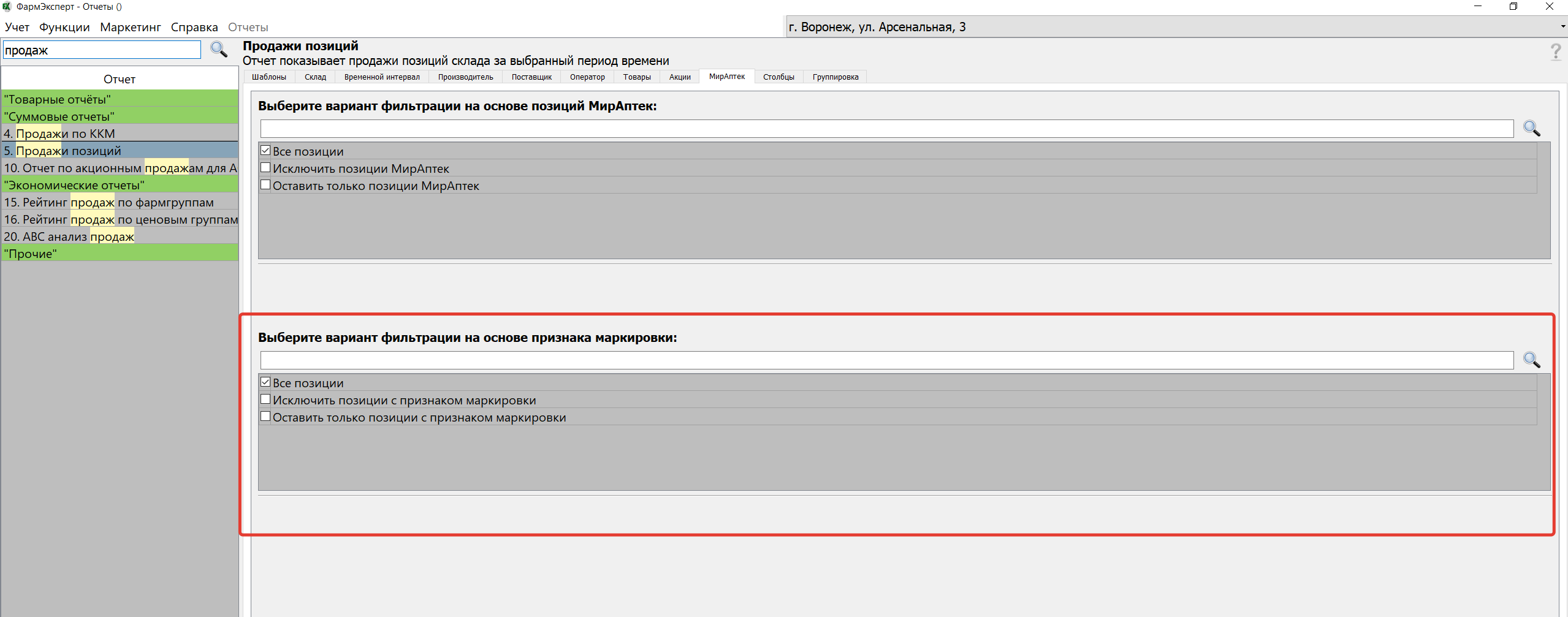 38. В отчёты «Продажи позиций» добавлена фильтрация по маркированным позициям.
