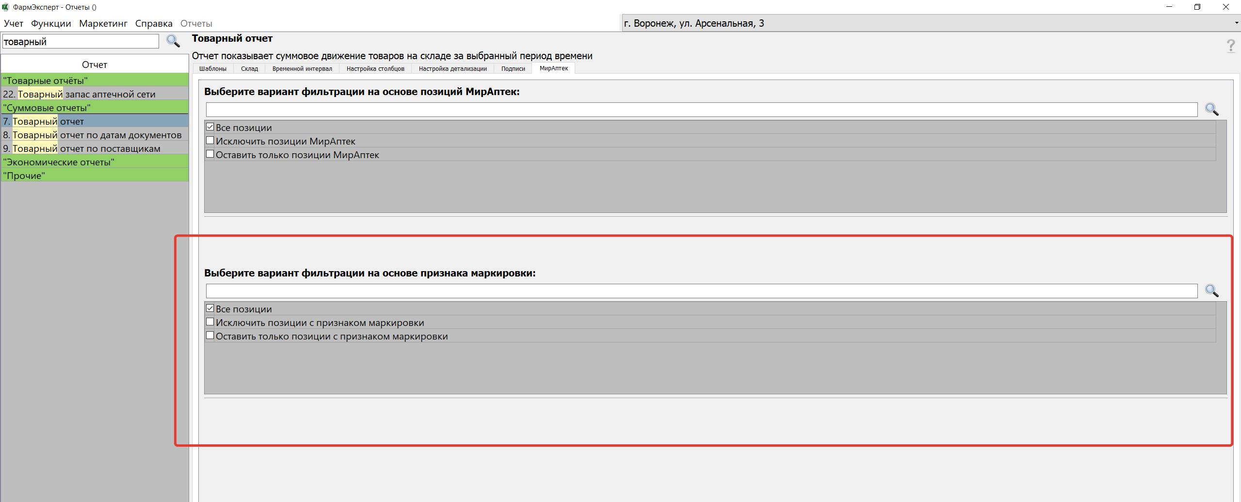 39. В Товарный отчёт добавлена фильтрация по маркированным позициям.