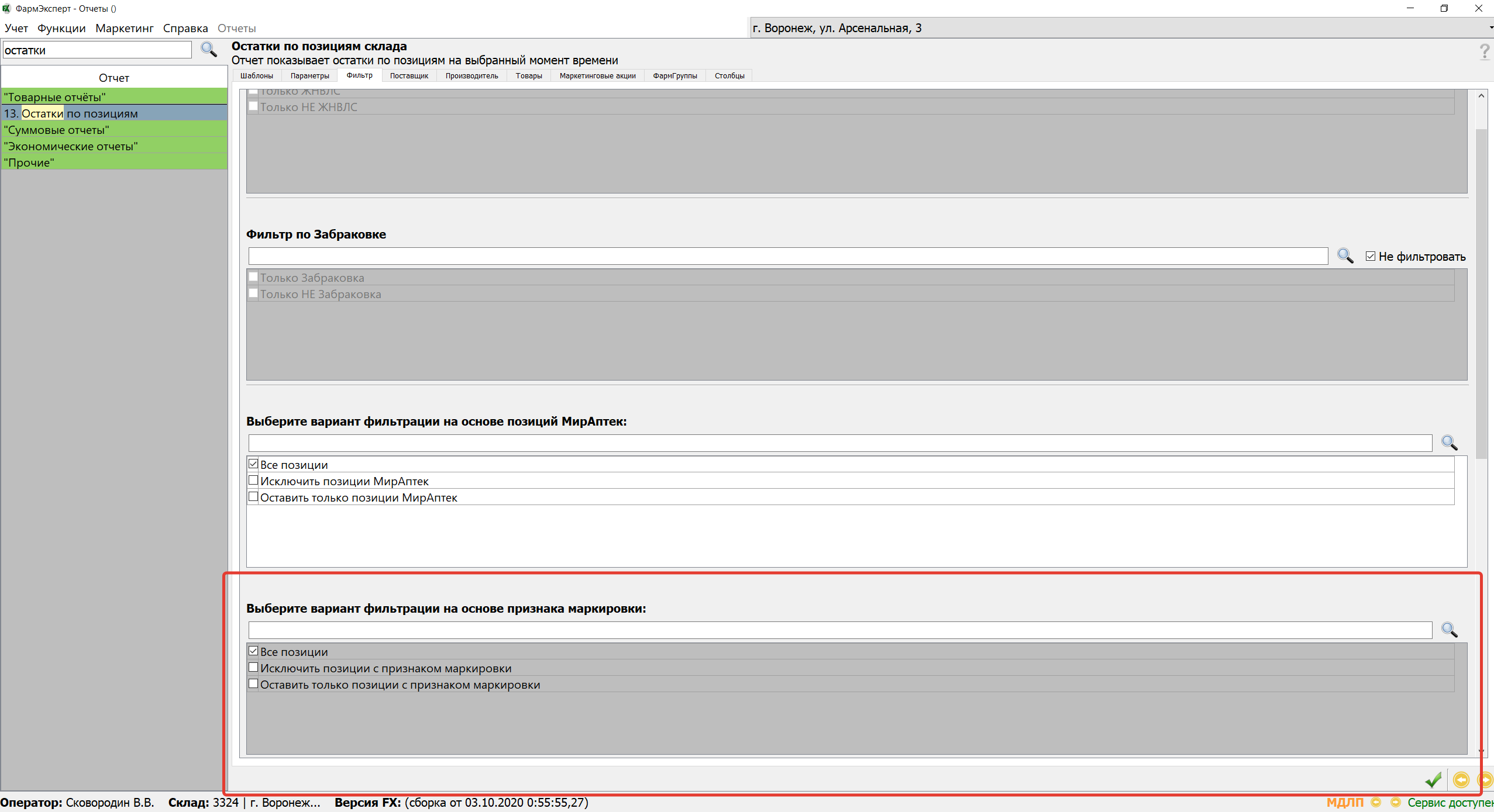 40. В отчёт «Остатки по позициям» добавлена фильтрация по маркированным позициям.