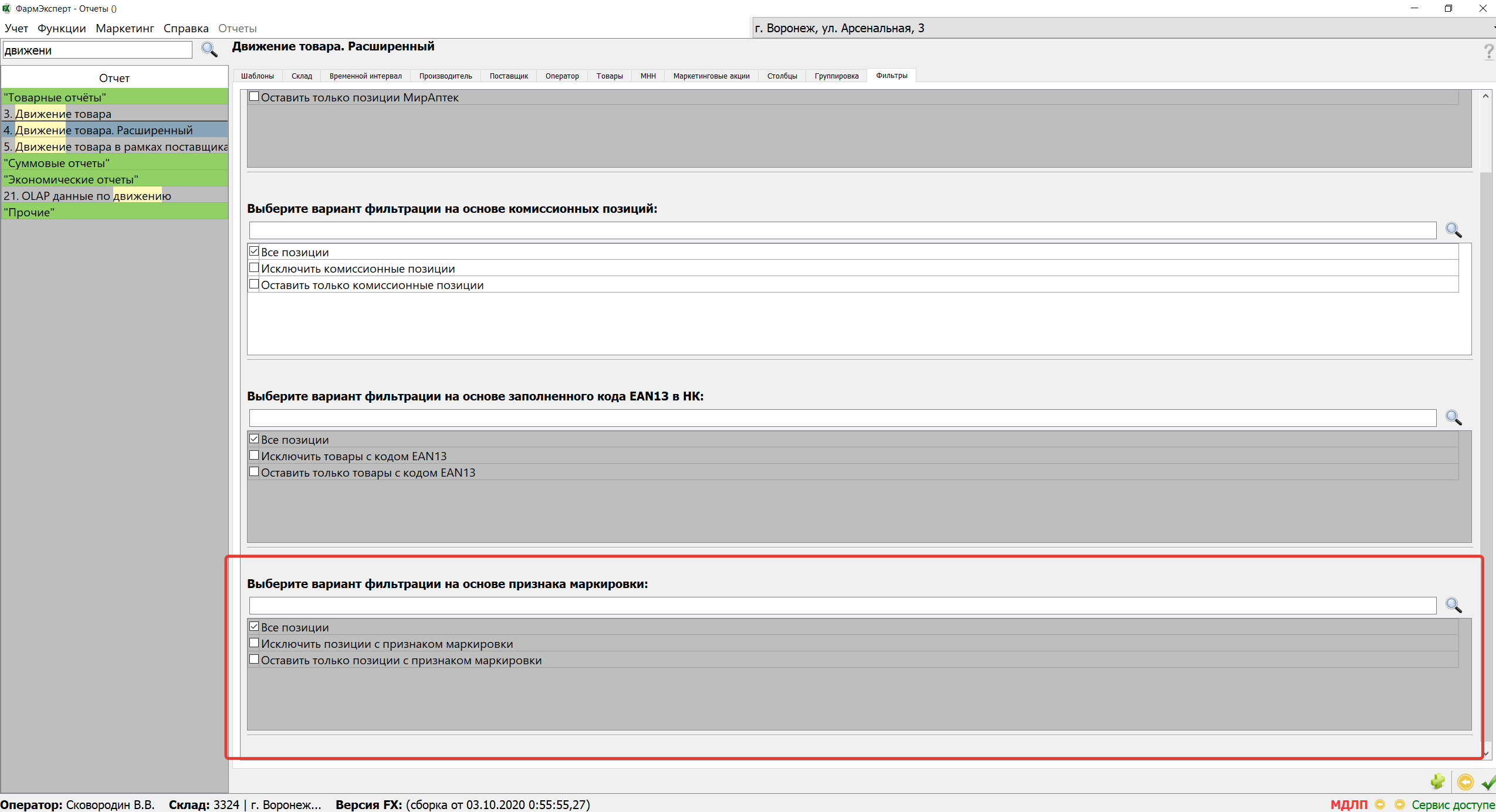41. В отчёт «Движение товара. Расширенный» добавлена фильтрация по маркированным позициям.