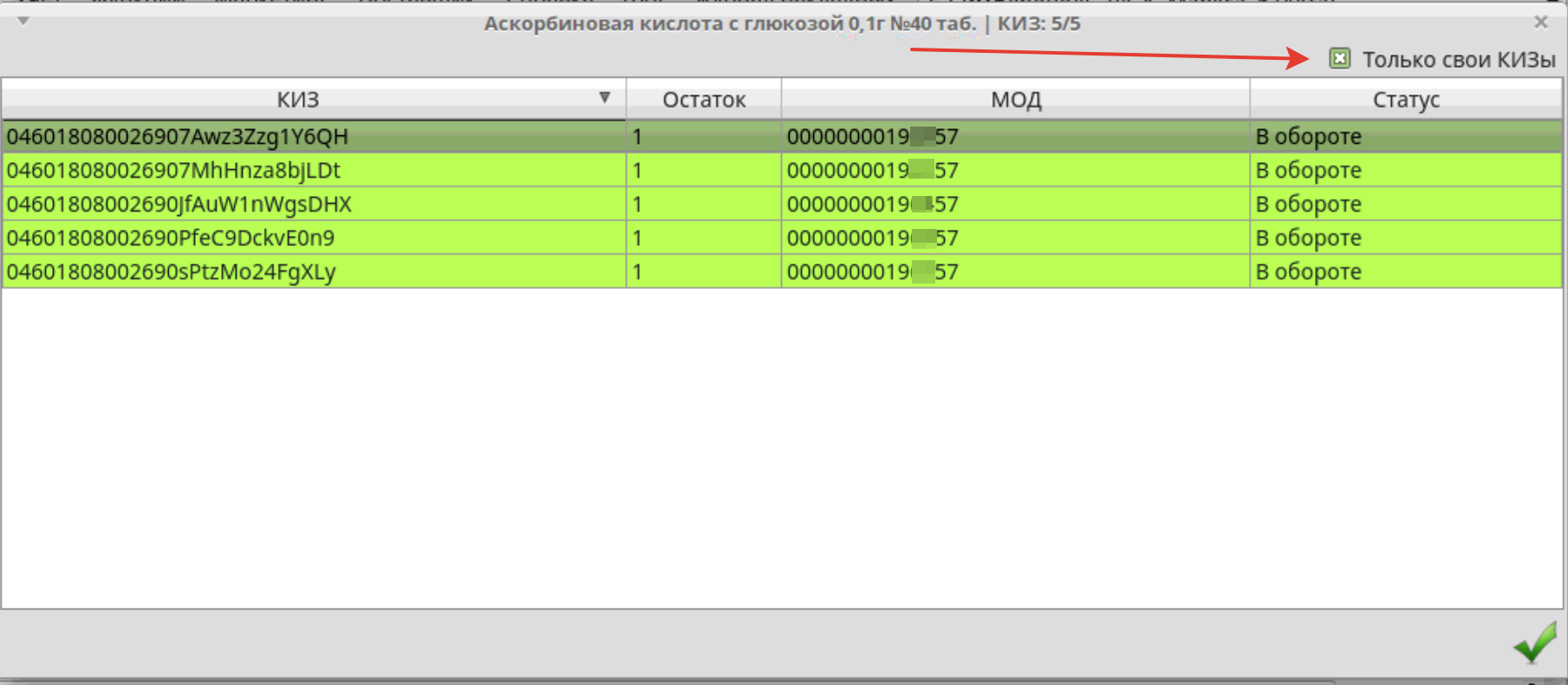 46. В окно с отображением списка КИЗов, привязанных к позиции, добавлена фильтрация по МОДу. Это, к примеру, помогает разобраться с правильной передачей КИЗов при перемещении товара.