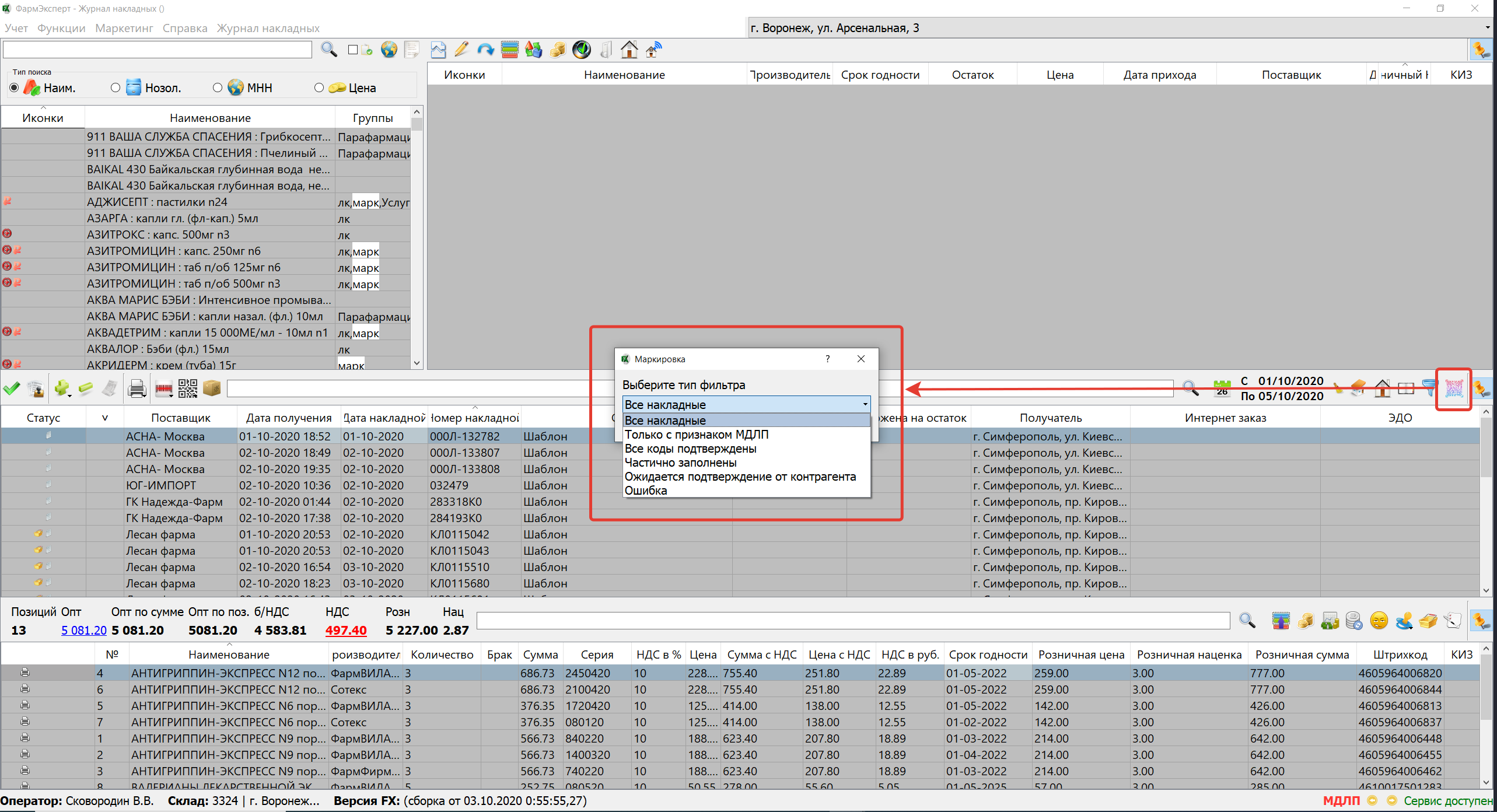 48. В Журнале накладных добавлена фильтрация по состоянию кодов маркировки позиций из накладной.