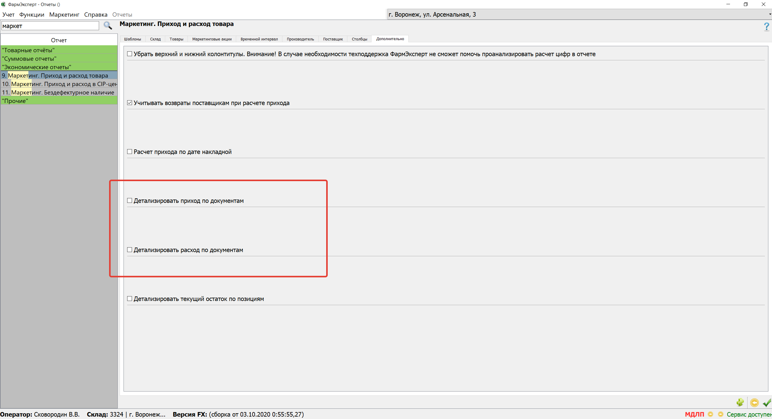 54. В отчёте «Маркетинг. Приход и расход товара» добавлена детализация по документам (а также по позициям и дням).