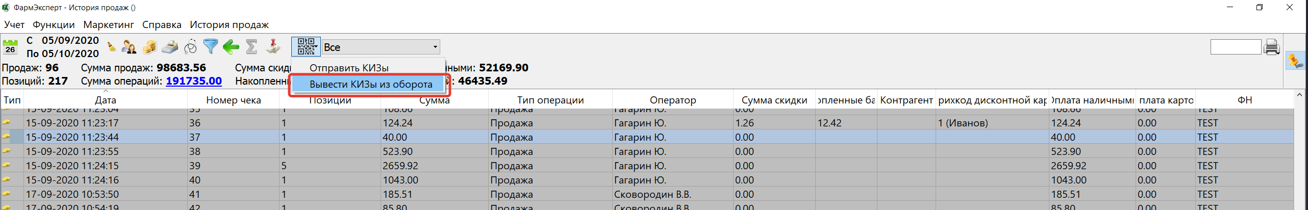 65. В связи с перебоями в работе ОФД и Честного Знака добавлена служебная функция вывода из оборота маркированного товара, путём отправки схемы 511 за ОФД. ВАЖНО!!! Данный функционал не предназначен для массового использования и в скором времени Честный Знак закроет возможность выводить товар из оборота не через ОФД. Состояние КИЗа можно понять по подсветке поля с номером чека (красная или зелёная).