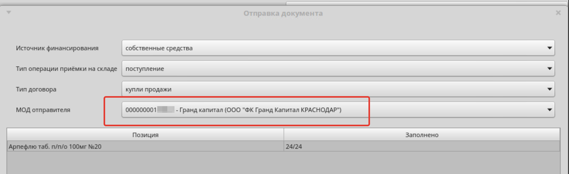 11. В окне отправки данных в МДЛП по накладной теперь отображается не только поставщик, но и его МОД.