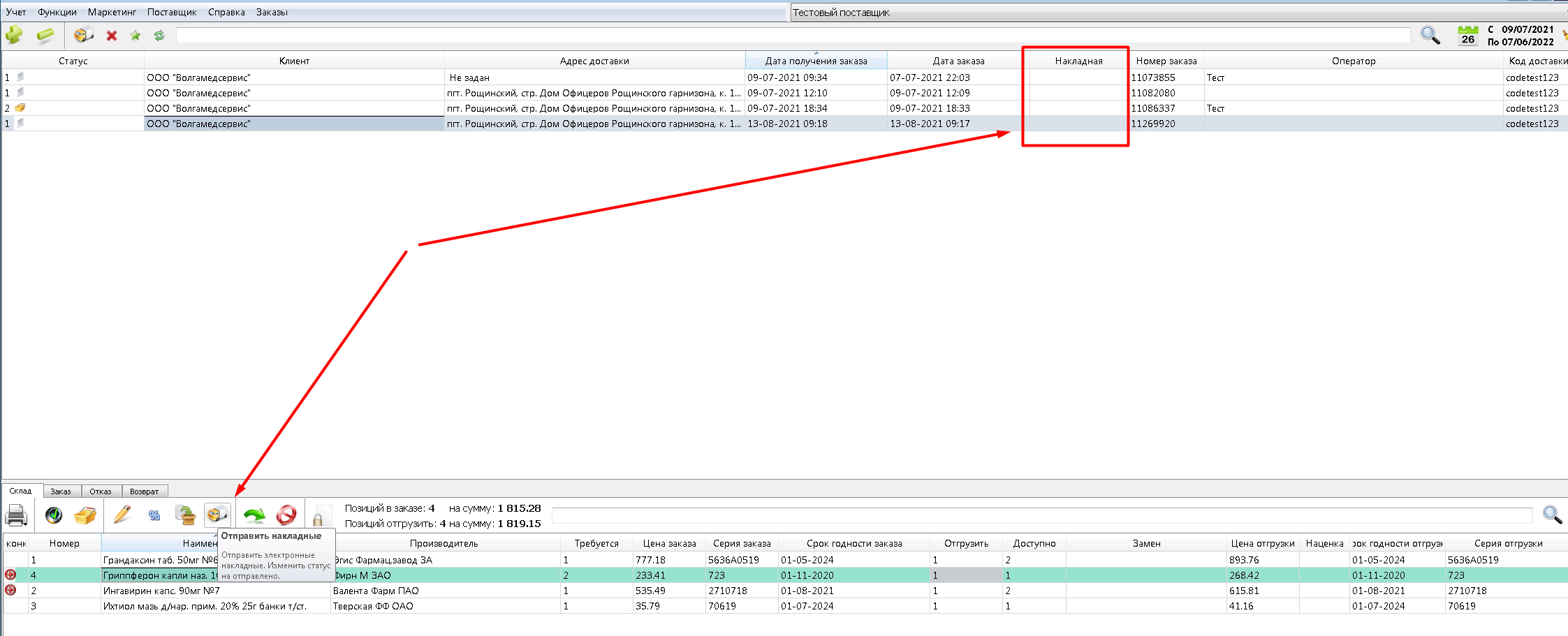 Состояние отправки электронных документов отображается в колонке «Накладная».