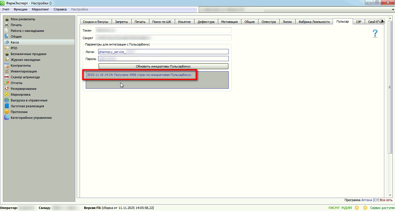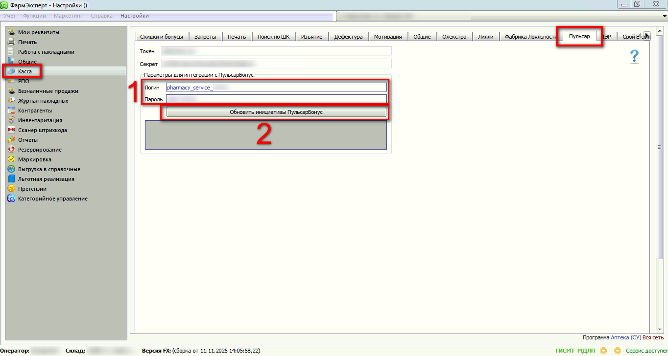 Для настройки откройте ФХ → Настройки → Касса → Пульсар, укажите логин и пароль (1) для доступа к интеграции и нажмите Обновить инициативы ПульсарБонус (2).