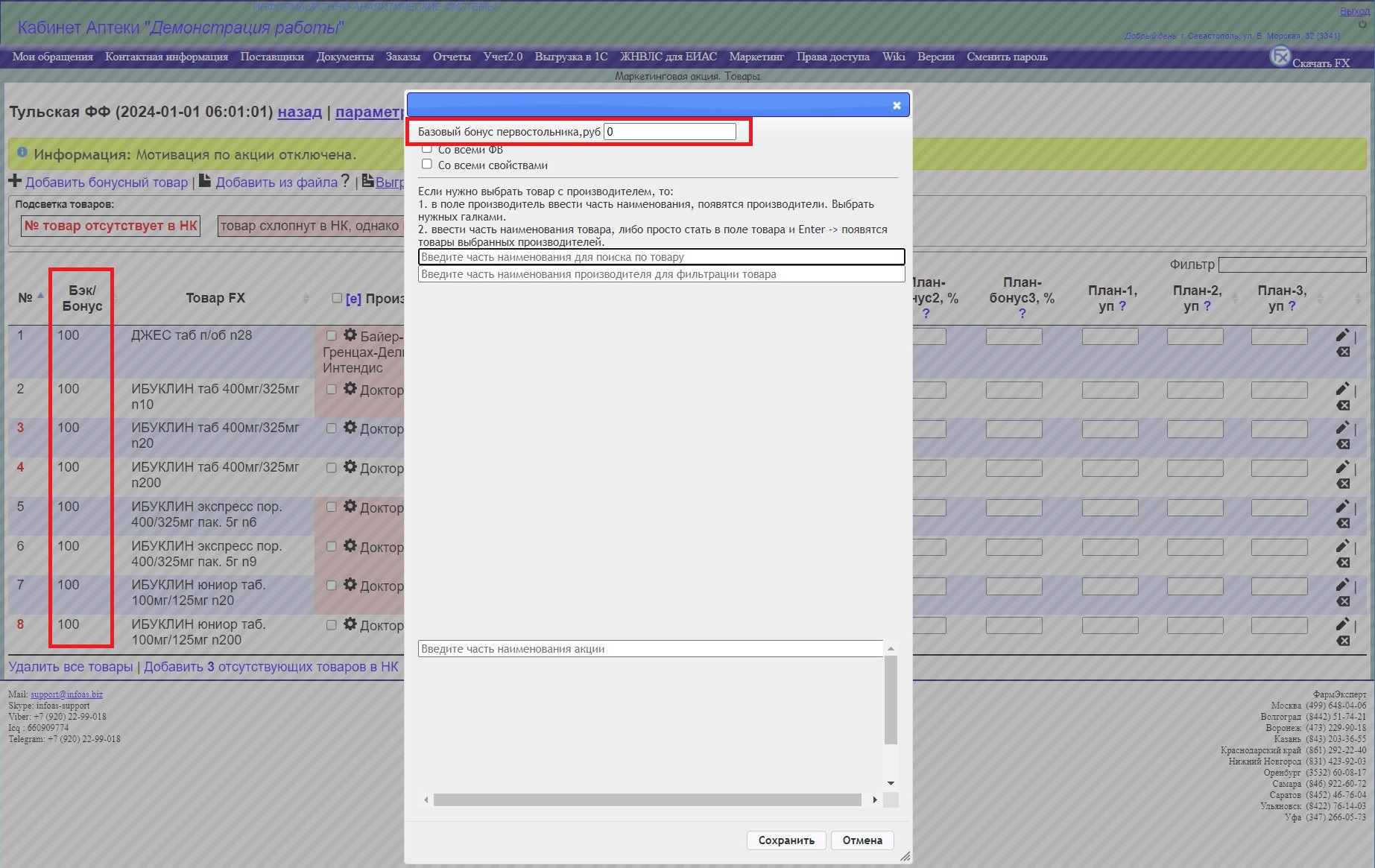 По каждому типу маркетинговой акции может быть настроен коэффициент, применяемый к Бэк/Бонусу товара. Получаемый бонус считается умножением заданного Бэк/Бонуса товара на коэффициент бонуса первостольника. Коэффициент применяется при выбранном принципе начисления бонусов операторам за продажу акционных товаров «Как бонус в руб. по строке маркетинговой акции».