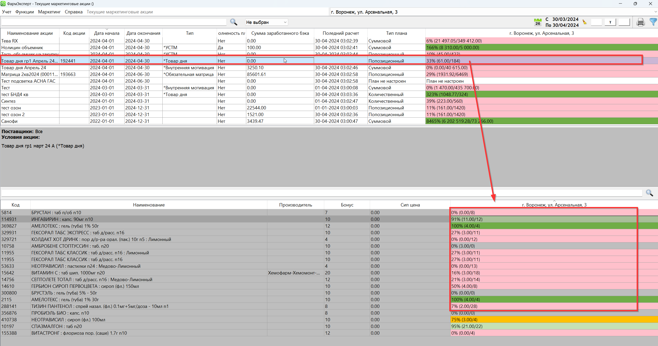 В разделе Маркетинг - Текущие акции можно контролировать выполнение плана по маркетинговым акциям. Для этого представлены значения самого плана, количества выполненной закупки или продажи, процент выполнения и прогноз выполнения